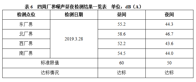根據(jù)焦作市和盛環(huán)境檢測技術(shù)有限公司檢測報告顯示,公司四周廠界噪聲晝/夜檢測值均能滿足《工業(yè)企業(yè)廠界環(huán)境噪聲排放標(biāo)準(zhǔn)》(GB12348-2008)中2類區(qū)排放限值(晝間60dB(A)/夜間60dB(A))要求,檢測結(jié)果見表6。